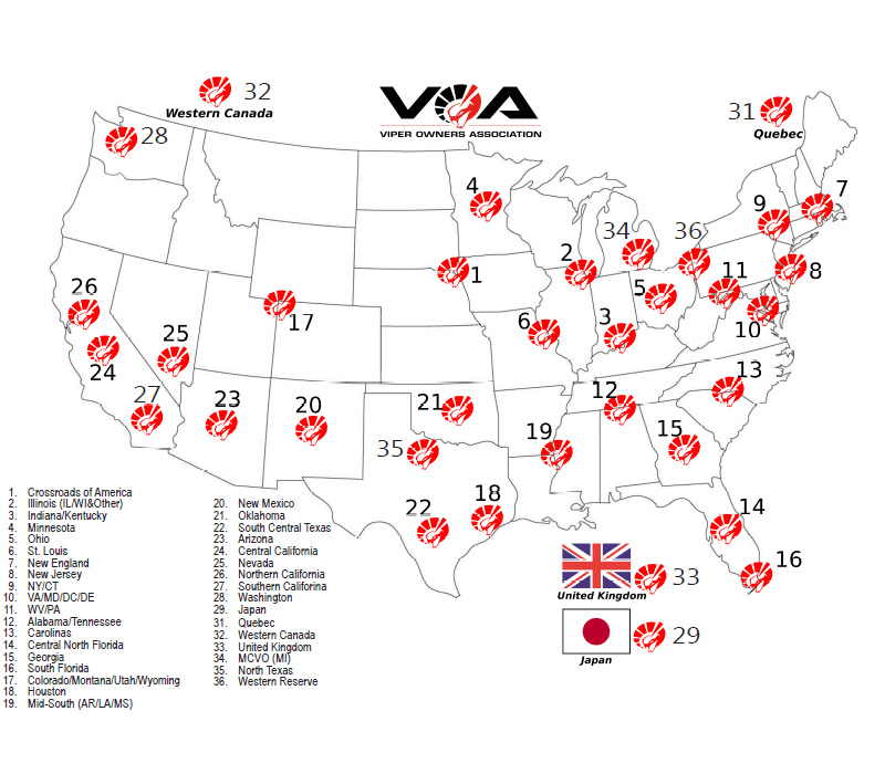 Driving your Viper is fun, driving your Viper with other Vipers is even more fun! Join your local region and meet other enthusiasts who are as crazy about Vipers as you are! One thing that we’ve learned, people generally join the club due to the car, but it’s the people that really make the experience complete. There’s nothing like being surrounded by Vipers and passionate people just like you! Below is the contact information for your national officers.
